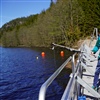 The floating guide racks like a 90-meter-long barrier with slanted bars extending 1.5 meters down into the water, spaced 5 cm apart. The openings are large enough for small fish to pass through, but the smart design ensures that salmon are guided past: