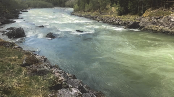 Slik ser det ut i elva når det vannet er overmettet med vann. Dette er elva Ekso med blakket vann under en gassovermetningsepisode 12.05 2018 (Foto: Eirik S. Normann, NORCE LFI)